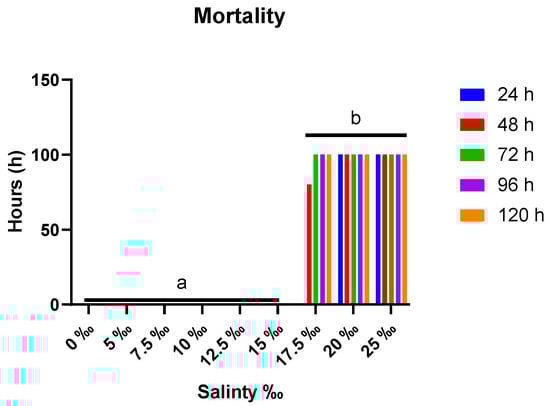 Mean mortality in A. grunniens under varying salinity conditions across different time points. Data are presented as means with different lowercase letters indicating statistically significant differences between salinity treatments (p < 0.05), while matching letter(s) indicate no significant difference according to two-way ANOVA. No mortality was observed at salinity levels of 0‰ to 15‰, while 100% mortality was recorded above 15‰ after 48 h.
