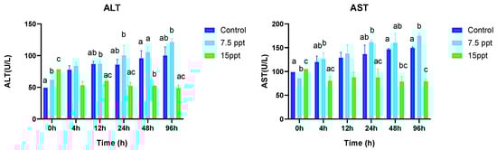 Mean activities of alanine transaminase (ALT) and aspartate transaminase (AST) in A. grunniens under varying salinity conditions across different time points. Data are presented as means and standard errors (SEs). Different lowercase letters indicate statistically significant differences between salinity treatments (p < 0.05), while matching letters indicate no significant difference according to two-way ANOVA. A combination of letters (e.g., ‘ab’) indicates that the group shares statistical similarities with both the ‘a’ and ‘b’ groups.