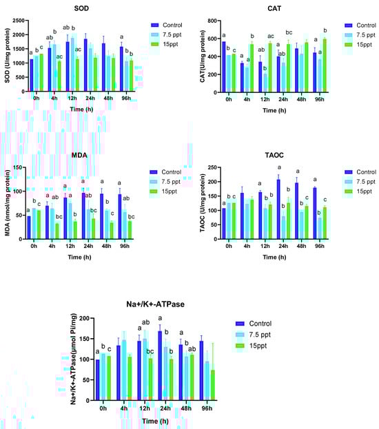 Mean activities of superoxide dismutase (SOD), catalase (CAT), malondialdehyde (MDA), total antioxidant capacity (TAOC), and sodium–potassium adenosine triphosphate Na+/K+-ATPase in A. grunniens under varying salinity conditions across different time points. Data are presented as means and standard errors (SEs). Different lowercase letters indicate statistically significant differences between the salinity treatments (p < 0.05), while matching letters indicate no significant difference according to two-way ANOVA. A combination of letters (e.g., ‘ab’) indicates that the group shares statistical similarities with both the ‘a’ and ‘b’ groups.