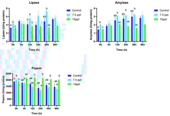Mean activities of digestive lipase, amylase, and pepsin in A. grunniens under varying salinity conditions across different time points. Data are presented as means and standard errors (SEs). Different lowercase letters indicate statistically significant differences between the salinity treatments (p < 0.05), while matching letters indicate no significant difference according to two-way ANOVA. A combination of letters (e.g., ‘ab’) indicates that the group shares statistical similarities with both the ‘a’ and ‘b’ groups.
