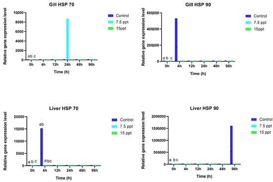 The HSP 70 and 90 activities in the gills and livers of A. grunniens were substantially impacted by salinity and time as displayed in Figure 6. In the gills, HSP 70 and HSP 90 activities followed a similar trend. They exhibited significant variations only at the beginning of sampling (0 h) between all the groups (p < 0.05), with no noticeable distinctions during the other sampling times. The liver HSP 70, on the other hand, displayed significant differences at the beginning of sampling (0 h) between all the groups (p < 0.05). From the 4 h to the 96 h sampling time, no significant variations were in the salinity treatment groups.