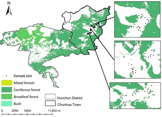 Map of sampling plot arrangement. Chunhua town is part of Hunchun district, and experimental plots were selected in cornfields located near forest edges, where wild boar damage was most severe. Due to the large geographic scale, sampling plots overlapped and were indistinguishable. Enlarged sections highlight the spatial arrangement of countermeasures and their distances from each other and the forest edge.