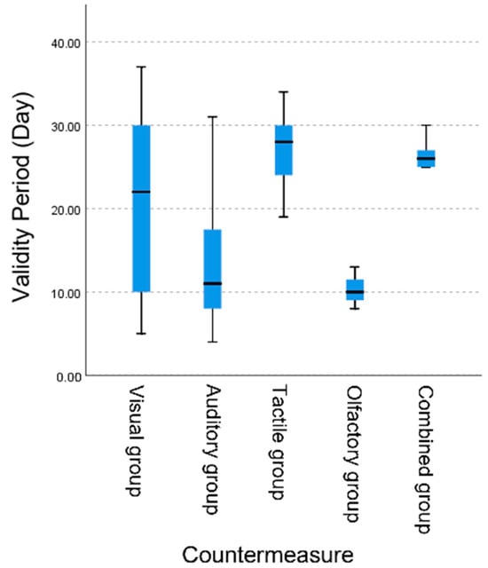 For the tactile group, the electric fencing with two and three wires significantly outperformed the electric fencing with one wire in the validity period (p < 0.05), with no significant difference between the two and three wire countermeasures (p > 0.05). Thus, the electric fencing with two and three wires were the most effective countermeasures for this group (Figure 3, Table A4).