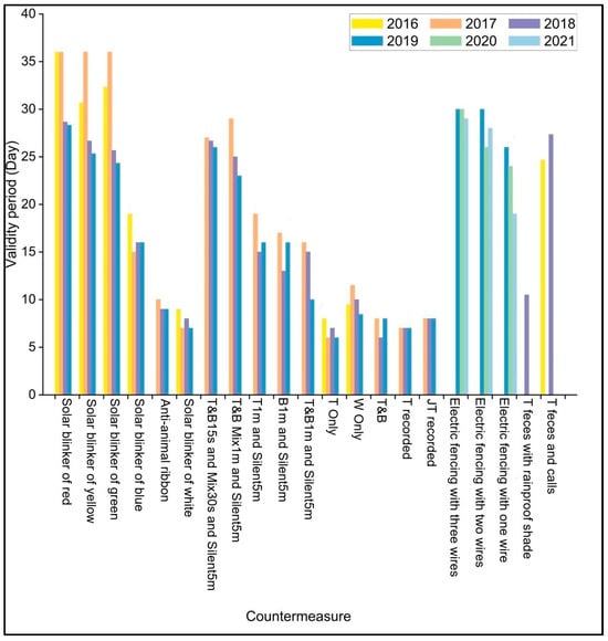 Across all groups, the best-performing countermeasures were the 1000 mA red, yellow, and green solar blinkers; T&B15s and Mix30s and Silent5m; electric fencing with two and three wires; and adult Amur tiger feces and calls (Table A5). The validity periods of the T&B Mix1m and Silent5m, as well as the adult Amur tiger feces with a rainproof shade, were significantly lower than those of the other best countermeasures (p < 0.05).