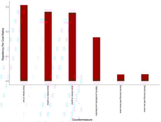 Comparative analysis of repellency per cost ratios for most effective countermeasures. Name of countermeasure refers to Table 1.