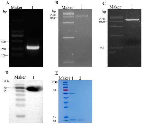 Mature Gga-AvBD11 is a cationic peptide composed of 82 amino acids, containing 12 cysteine residues and 6 disulfide bonds (LPRDTSRCVGYHGYCIRSKVCPFAAFGTCSWRQTCCCVDTTSDFHTCKDGGHCVSPKKIRCLEEQLGLCPLKRWTCCKEI) []. Firstly, we amplified the AvBD11 gene fragment (Figure 1A, lane 1); pCold-TF was double-digested in order to obtain a linear vector (Figure 1B, lane 1). We recombined the AvBD11 fusion gene fragment with the pCold linear vector and transferred it to E. coli DH5α. After extraction of the plasmid, it was identified by double digestion with XhoI and EcoRI, and two linear fragments of the expected size were obtained (Figure 1C, lane 1). Following the induction of protein expression in recombinant E. coli DE3, the bacteria underwent ultrasound treatment, and recombinant AvBD11 (approximately 70 kDa) matching the expected target protein size was identified through Western blotting (Figure 1D). Subsequently, AvBD11 protein (approximately 11 kDa) was isolated using HRV3C protease (Figure 1E, lane 2).