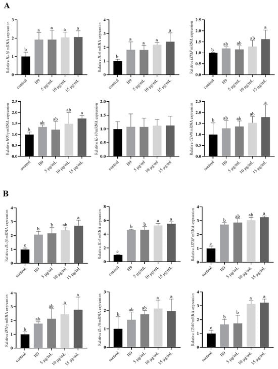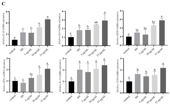 The relative expression of different cytokines varied with the time of analysis (Figure 2). At 2 h, IL-1β and Interleukin-6 (IL-6) were more significantly increased in all test groups than in the control group (p < 0.05). The addition of AvBD11 at a final concentration of 15 μg/mL resulted in significantly increased LITAF, IFN-γ, and CD40 compared to the control groups (p < 0.05). At 6 h, IL-1β, IL-6, LITAF, and CD40 were more significantly increased in all experimental groups than in the control group (p < 0.05). IL-1β, IL-6, and CD40 were more significantly increased in the 15 μg/mL AvBD11 group than in the H9 and 5 μg/mL groups (p < 0.05), and IL-6 was significantly more increased in the 10 μg/mL AvBD11 group than in the H9 and 5 μg/mL groups (p < 0.05); At 10 h, IL-1β, IL-6, IL-10, and CD40 were more significantly increased in all test groups than in the control group (p < 0.05). IL-1β and IFN-γ were more significantly increased in the 15 μg/mL and 10 μg/mL groups than in the H9 group. IL-1β, LITAF, IFN-γ, and CD40 were more significantly increased in the 15 μg/mL group than in the 10 μg/mL group (p < 0.05).
