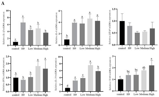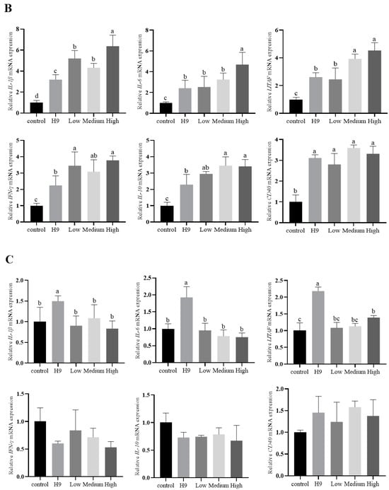 Three days after H9N2 infection (Figure 3A), IL-1β, IL-6, and IL-10 were more significantly increased in all test groups than in the control group (p < 0.05). IL-1β was more significantly increased in the H9 group than in the AvBD11-treated group (p < 0.05). IFN-γ and IL-10 were more significantly increased in the mid- and high-dose groups than in the H9 and low-dose groups (p < 0.05). After 7 days of infection (Figure 3B), cytokine expression levels were more significantly increased in all test groups than in the control group (p < 0.05). IL-1β, IL-6, LITAF, IFN-γ, and IL-10 were more significantly increased in the high-dose group than in the H9 group (p < 0.05). IL-1β, LITAF, and IL-10 were more significantly increased in the mid-dose group than in the H9 group (p < 0.05). After 14 days of infection (Figure 3C), IL-1β, IL-6, and LITAF were significantly increased in the H9 group compared with the other groups (p < 0.05).
