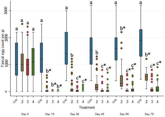 Box plots indicating the effects of the different anthelmintic treatments on fecal egg count (epg) among 4 different groups per sampling occasion —Group 1: control group or untreated animals (blue color); Group 2: albendazole-treated animals (brown color); Group 3: pour-on eprinomectin-treated animals (red color); Group 4: injectable eprinomectin-treated animals (green color). a, b and c indicate statistically significant differences (p ≤ 0.05) among the 4 different treated groups per sampling; * indicates statistical differences at p < 0.001.