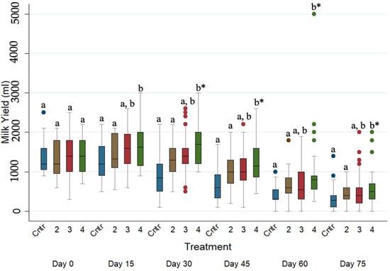 Box plots indicating the effects of the different anthelmintic treatments on daily milk yield (mL) among 4 different groups per sampling occasion —Group 1: control group or untreated animals (blue color); Group 2: albendazole-treated animals (brown color); Group 3: pour-on eprinomectin-treated animals (red color); Group 4: injectable eprinomectin-treated animals (green color). a and b indicate statistically significant differences (p ≤ 0.05) among 4 different treated groups per sampling; * indicates statistical differences at p < 0.001.