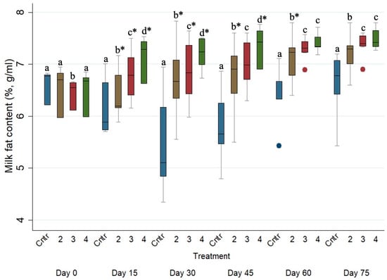The evolution of the milk fat concentration (%) across the studied period for the four different treated groups is presented in Figure 3. The milk fat concentration (%) of the control group (i.e., Group 1) was significantly lower (p ≤ 0.05) than those of Groups 2, 3 and 4 on every sampling occasion after Day 0. Moreover, the milk fat concentrations (%) of Group 2 were significantly lower (p ≤ 0.05) than those of Groups 3 and 4 on every sampling occasion after Day 0.
