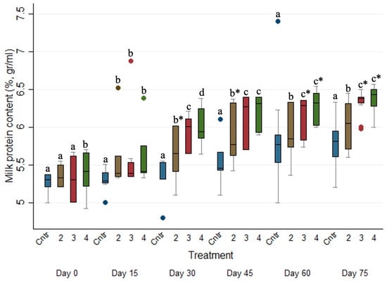 The evolution of milk protein concentration (%) across the studied period for the four different treated groups is presented in Figure 4. The milk protein concentration (%) of Group 1 was significantly lower (p ≤ 0.05) than those of Group 2, 3 and 4 on every sampling occasion after Day 0. Moreover, the milk protein concentration (%) of Group 2 was significantly lower (p ≤ 0.05) than the respective ones of Groups 3 and 4 on every sampling occasion after Day 15.