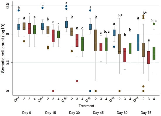 Box plots indicating the effects of the different anthelmintic treatments on somatic cell count (log10 SCC) among the 4 different groups per sampling occasion—Group 1: control group or untreated animals (blue color); Group 2: albendazole-treated animals (brown color); Group 3: pour-on eprinomectin-treated animals (red color); Group 4: injectable eprinomectin-treated animals (green color). a, b and c indicate statistically significant differences (p ≤ 0.05) among the 4 different treated groups per sampling; * indicates statistical differences at p < 0.001.