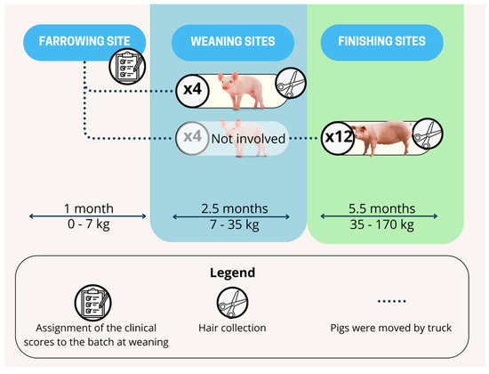 - Levallois, P.; Leblanc–Maridor, M.; Lehébel, A.; Gavaud, S.; Lieubeau, B.; Hervé, J.; Fourichon, C.; Belloc, C. Hair cortisol concentration in finishing pigs on commercial farms: Variability between pigs, batches, and farms. Front. Vet. Sci. 2024, 10, 1298756. [Google Scholar]