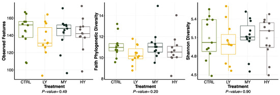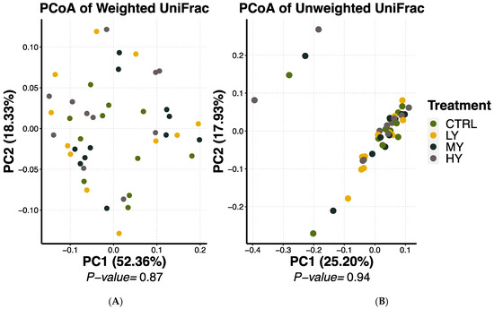 The forward reads were trimmed using the FASTX-Toolkit and the resulting sequences were processed using the QIIME 2.0 software pipeline [23]. Sequences with a quality score ≥20 were filtered for quality control with DADA2 [24]. The samples were rarefied to an even depth and the taxonomy was assigned using the Naive Bayes classifiers trained on the Silva database (v.138) [25,26,27]. Diversity analyses were performed via the q2-diversity plugin, and the β-diversity was calculated using the weighted and unweighted UniFrac distances [28]. Visualization of the UniFrac distances was achieved using principal coordinate analysis (PCoA) plots.