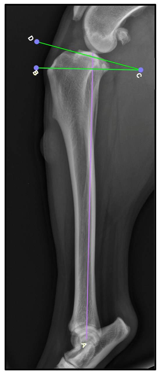 Determination of the tibial plateau angle. A: line parallel to the tibial sagittal plane; B–D: line perpendicular to the previous one. The tibial plateau angle is highlighted in green.