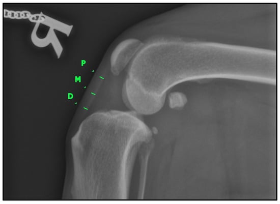 Lateral knee radiographic view (LL) illustrating the measurement of patellar ligament thickness. The ligament was divided into four equal segments, and thickness was recorded at three predefined reference points: proximal (P), middle (M), and distal (D). These measurement locations are marked in green for clarity.