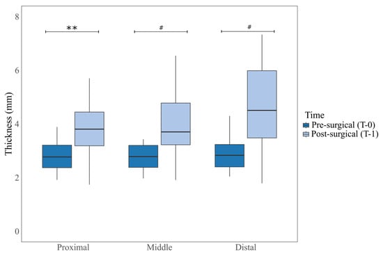 Box plot representation of measurements at different anatomical points, preoperative and postoperative. Statistically significant differences between groups at ** p < 0.01, # p < 0.001.