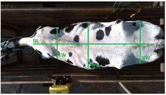 - Ozkaya, S.; Bozkurt, Y. The relationship of parameters of body measures and body weight by using digital image analysis in pre-slaughter cattle. Arch. Anim. Breed. 2008, 51, 120–128. [Google Scholar] [CrossRef]