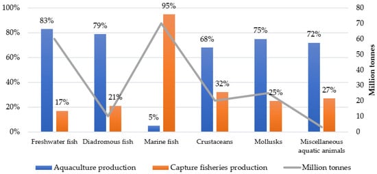 Freshwater fish lead aquaculture production at 83%, followed by diadromous fish at 79%. These high percentages demonstrate the successful implementation of farming techniques in these sectors. Mollusks and miscellaneous aquatic animals also show a strong aquaculture presence at 75% and 72%, respectively. Marine fish present a striking contrast, with capture fisheries accounting for 95% of production. This dominance reflects the traditional and continued importance of wild-catch methods in marine environments. Crustaceans show a more balanced distribution, with capture fisheries representing 32% of production (Figure 1) [6].