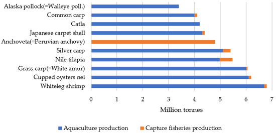 The top ten species in the world’s fisheries and aquaculture, 2024. Source: Own editing (2025) based on [6].