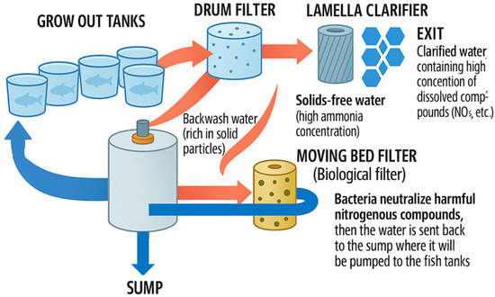 Increasing consumer demand has stimulated the development of industrial fish farming, which involves fish production in relatively small areas, with a high degree of mechanization that maintains water quality and temperature in the optimum range, and at maximum yield. The most prominent forms of intensive fish farming include RASs [25], which operate under closed, precisely controlled conditions, allowing the production of large quantities of fish flesh of constant quality in a short time, independent of external climatic factors [26,27]. RASs have low water and land requirements but require significant initial investment, high operating costs, and a high level of expertise; however, they are capable of producing a wide range of fish species and provide a continuous supply of fish [28]. This allows for a safer and more efficient form of common carp production, with a shorter production cycle [29,30,31,32,33]. Figure 3 illustrates a typical RAS setup.
