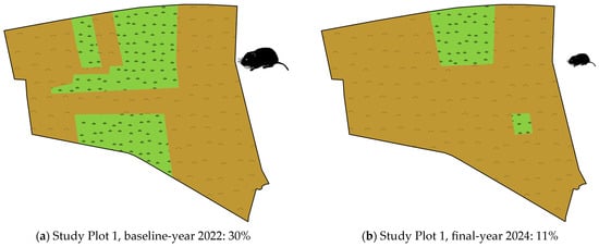 Prey availability is determined by vole density and the extent of small mammal habitats accessible to hen harriers. While vole density is primarily governed by intrinsic population cycles, habitat extent is predominantly shaped by anthropogenic agricultural land management. In the four main inner-alpine Carinthian study plots, the land cover balance of forage crops exhibited a pronounced decline. During the baseline years (2020: n = 1; 2022: n = 2; 2023: n = 1), forage crop proportions averaged 33.0% ± 14.9 (median: 31), but by the winter of 2024/25, they had markedly decreased to 15.5% ± 15.6 (median: 11). Although the decline in forage crop proportions within the study plots was apparent, statistical analysis was not conducted due to the limited number of sampled sites. Figure 4 illustrates this trend using two representative study plots. In these cases, the vole availability index was consistently moderate to high in both the initial and final years. Hen harrier territories were established only when foraging areas were spatially extensive, but none formed in the final winter, as forage crop proportions declined below critically low thresholds.