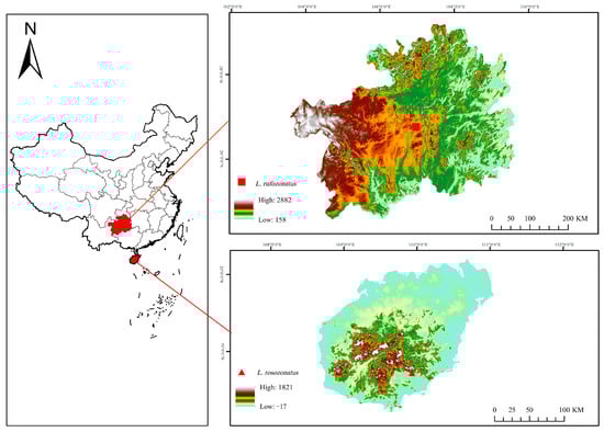 Species maps of L. rufozonatus and L. rosozonatus. The red square icon indicates the sampling site of L. rufozonatus in Guizhou Province, and the red triangle icon indicates the sampling site of L. rosozonatus in Hainan Province.