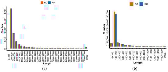Information about the transcripts obtained by sequencing. (a) Distribution of transcript length. (b) Distribution of the longest transcript protein length. RO: L. rosozonatus; RU: L. rufozonatus.