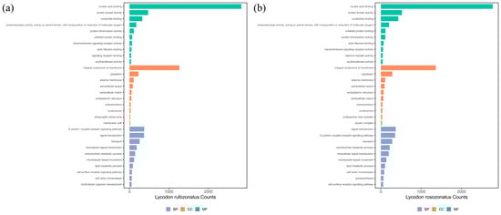 (a) Histogram of Gene Ontology (GO) classification statistics of L. rufozonatus. (b) Histogram of Gene Ontology (GO) classification statistics of L. rosozonatus. The horizontal axis shows the number of genes in different GO entries (functional categories); the vertical axis shows the specific category name of GO functional classification. Green is for molecular function (MF), orange is for cell composition (CC), and blue is for biological process (BP).