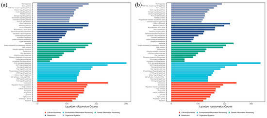 (a) Bar chart of KEGG pathway classification statistics of L. rufozonatus. (b) Bar chart of KEGG pathway classification statistics of L. rosozonatus. The horizontal axis shows the number of genes involved in the pathway, and the vertical axis shows the name of the specific KEGG pathway. The colors are as follows: red (cellular processes); green (genetic information processing); blue–green (environmental information processing); dark blue (metabolism); light blue (organismal systems).