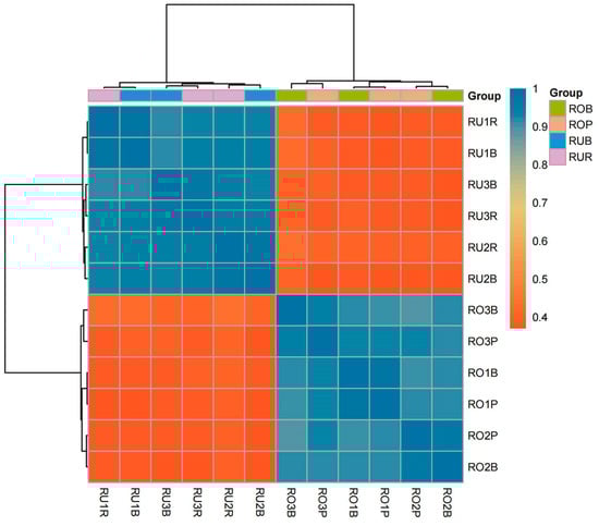 Correlation heatmap. The correlation of biological replicates was close to 1, indicating high consistency between samples (blue indicates high correlation; red indicates low correlation). ROB: black skin scales of L. rosozonatus; ROP: pink skin scales of L. rosozonatus; RUB: black skin scales of L. rufozonatus; RUR: red skin scales of L. rufozonatus; 1, 2, and 3 represent different individual numbers.
