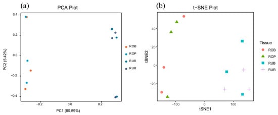 Dimensionality reduction analysis. (a) Principal component analysis (PCA): samples from different groups were grouped together well on the PC1 and PC2 axes, showing that the main differences between the samples were seen in the experiment. (b) t-distributed stochastic neighbor embedding (t-SNE): t-SNE dimensionality reduction analysis further confirmed the grouping of the samples, showing significant differences between species and the similarity of the data within groups. ROB: black skin scales of L. rosozonatus; ROP: pink skin scales of L. rosozonatus; RUB: black skin scales of L. rufozonatus; RUR: red skin scales of L. rufozonatus.
