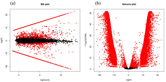 Analysis of genes with different expressions between RUR and ROP. (a) MA plot: The horizontal axis (logCounts) shows the average expressions of genes, and the vertical axis (logFC) shows the logarithmic change in the gene expression. Positive logFC values indicate the upregulation of ROP genes relative to RUR genes, and negative values indicate the downregulation of genes (p < 0.05). (b) Volcano plot: The horizontal axis (logFC) represents the logarithmic fold change of genes, the left side of the horizontal axis shows genes downregulated by ROP relative to RUR, and the right side shows upregulated genes. The vertical axis (−log10(FDR)) represents the significance of differentially expressed genes; the higher the value, the more significant the differential expression of the genes (p < 0.05) Red dots represent significantly differentially expressed genes, while black dots represent non-significantly differentially expressed genes.