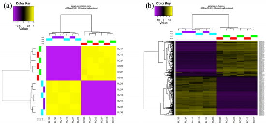 Correlation heatmap and expression heatmap of differentially expressed genes. (a) Correlation heatmap: The horizontal and vertical axes represent different samples (e.g., RO1P, RU2R, etc.). The color key ranges from purple (negative correlation, −0.5) to yellow (positive correlation, +1). The yellow area shows a high positive correlation between samples, while purple shows a negative or low correlation. The color of the cells in the heatmap shows the correlation between two samples (Pearson correlation coefficient). (b) Expression heatmap: the horizontal axis represents the samples, and the vertical axis represents the names of the genes that were found to be expressed, from purple (low expression, −10) to yellow (high expression, +10).