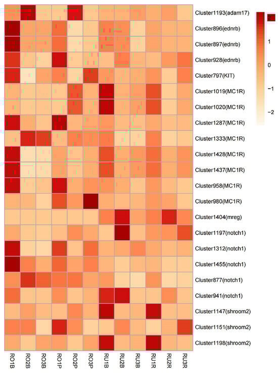 Among these differentially expressed genes, a comprehensive analysis of the single-copy homologous genes and amino acid protein sequences of five species revealed the identification of common body color-related genes shared by L. rufozonatus and L. rosozonatus. This analysis also identified 22 common gene loci that had mutated (Table S3). These included eight loci in the MC1R gene, eight loci in the shroom2 gene, five loci in the notch1 gene, five loci in the ednrb gene, one locus in the adam17 gene, one locus in the mreg gene, and one locus in the KIT gene (Table 4). Concomitantly, the expression levels of the genes located at these mutation sites exhibited varying degrees of difference between the different scale color groups of the two species (Figure 9). The consensus color-associated genes and differentially expressed genes were identified through their overlap to identify genes exhibiting significantly altered expression and SAAP. Consequently, three genes with notable discrepancies, RU_DN1145_c3_g2 (mreg), RU_DN10511_c0_g1 (notch1), and Unigene11172 (notch1), were identified as genes of particular importance (Table 5). Melanoregulin (mreg) is a protein that is involved in the transport and release of melanosomes. It regulates the melanin transport pathway, particularly in melanocytes, and is responsible for the distribution and export of melanin granules. The expression of the mreg gene was markedly downregulated in ROP (logFC = −15.19, FDR = 1.39 × 10−35), suggesting its potential involvement in the regulation of diverse body color phenotypes. The expression of the RU_DN10511_c0_g1 (notch1) gene was significantly downregulated in the ROP samples (logFC = −10.83, FDR = 7.40 × 10−27), which may result in a reduction in the melanocyte differentiation capacity.