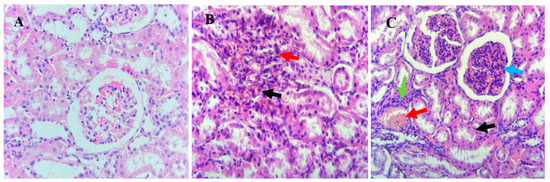 Histological analysis of kidney tissues from Awassi lambs supplemented with organic copper. (A) Lambs supplemented with 0 g of organic copper (T1). (B) Lambs supplemented with 0.5 g of organic copper (T2). (C) Lambs supplemented with 1 g of organic copper (T3). The kidney tissues were stained with hematoxylin and eosin and observed under 40× magnification using a light microscope.