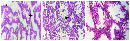 Histological analysis of testes tissues from Awassi lambs supplemented with organic copper. (A) Lambs supplemented with 0 g of organic copper (T1). (B) Lambs supplemented with 0.5 g of organic copper (T2). (C) Lambs supplemented with 1 g of organic copper (T3). The testes tissues were stained with hematoxylin and eosin and observed under 40× magnification using a light microscope.
