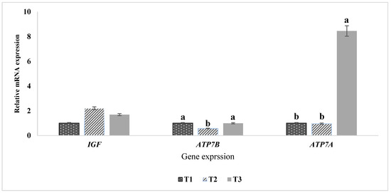 Expression of IGF1, ATP7A, and ATP7B genes in the blood serum of Awassi lambs. The mRNA expression levels of IGF1, ATP7A, and ATP7B were quantified using qRT-PCR, with GAPDH as the reference gene for normalization. Treatment groups include T1 (control: 0 g Cu/kg DM), T2 (0.5 g Cu/kg DM), and T3 (1 g Cu/kg DM). Bars with different letters (a, b) indicate significant differences (p < 0.05) among the groups.