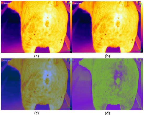 Thermal infrared image preprocessing process (a) Original image; (b) Normalized image; (c) Standardized image; (d) Denoised image.