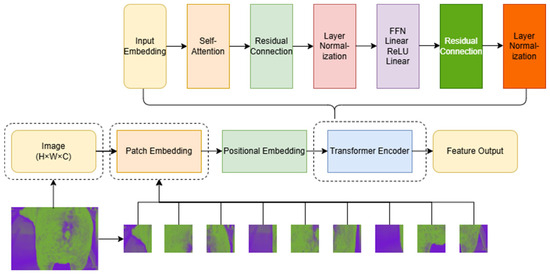 ViT is an image processing model based on a self-attention mechanism. Unlike traditional CNNs, the ViT treats images as sequential data, enabling it to better capture global information and long-range dependencies [22]. Here, image feature extraction was implemented using a custom VisionTransformerFeatureExtractor class, which combined the design principles of convolution operations and Transformer encoders, as illustrated in Figure 4.