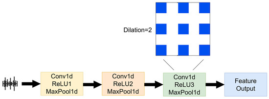 In this study, we propose a CNN architecture specifically designed for audio feature extraction. It consisted of three main convolutional layers that extract features from audio signals using a combination of convolution, activation, and pooling operations, as illustrated in Figure 5. In the third convolutional layer, dilated convolution was introduced. Dilated convolution, also known as atrous convolution, expands the receptive field by inserting gaps between kernel elements without increasing the computational cost. The introduction of dilated convolution allows the network to capture features over a larger range with fewer layers and parameters, facilitating the extraction of information relevant over longer time spans in the audio signal.