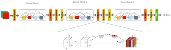 In multi-modal data processing tasks, we employ the DenseNet architecture originally proposed by Huang et al. as the backbone network. The advantage of DenseNet lies in its dense connectivity mechanism, which effectively reuses features, enhancing feature representation and gradient flow. However, to further improve DenseNet’s performance in handling fused features, we introduce the Squeeze-and-Excitation (SE) block originally proposed by Hu et al. [30]. The network first used standard convolutional layers to extract fused features. The feature maps outputted from Dense Block 1 were processed by SE Block 1 for channel-wise weighting, followed by pooling for downsampling. The output from Dense Block 2 was weighted by SE Block 2, followed by pooling for downsampling. The feature maps output from Dense Block 3 were weighted by SE Block 3 and then underwent pooling before passing into the fully connected layer to generate the final output, as illustrated in Figure 6.