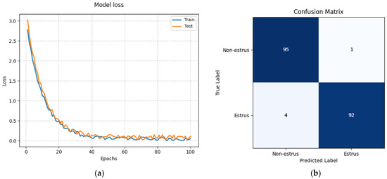 Loss and confusion matrix of the model on the training and test sets (a) Model loss; (b) Confusion matrix.