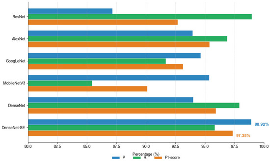 To demonstrate the effectiveness of using the improved DenseNet-SE backbone network, a comprehensive comparison was conducted with ResNet [31], AlexNet [32], GoogLeNet [33], and MobileNetV3 [34] under identical training parameters. The experimental results, summarized in Table 4, revealed that the DenseNet-SE model achieved superior performance across multiple evaluation metrics, including precision and F1-score, reaching 98.92% and 97.35%, respectively. This outstanding performance indicates that the improved architecture significantly enhanced the model’s ability to process data from both audio and image modalities.
