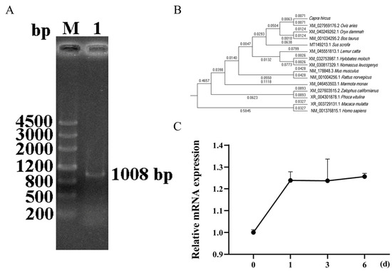 Molecular characterization and expression analysis of SIRT5 in goats. (A) Electrophoretic analysis of the cloned goat SIRT5 gene. Lane M: DNA Marker III; Lane 1: PCR product of the SIRT5 gene. (B) Phylogenetic analysis of SIRT5 across different species, demonstrating evolutionary relationships. (C) Temporal expression profile of SIRT5 mRNA during adipocyte differentiation.