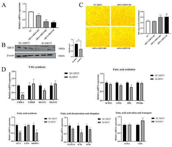 Effect of SIRT5 gene interference on lipid deposition in goat precursor adipocytes. (A) SIRT5 gene interference efficiency. (B) SIRT5 protein expression after interference detected by WB. (C) Oil Red O staining and OD value of Oil Red O staining extraction after SIRT5 (SI-SIRT5) interference (510 nm). (D) Effect of SIRT5 gene interference on the expression levels of genes related to lipid metabolism. Data are shown as mean ± SEM, ‘*’ indicates p < 0.05, ‘**’ indicates p < 0.01, and ‘***’ indicates p < 0.001.