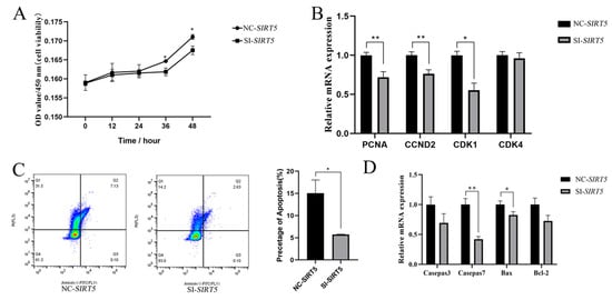 Effects of SIRT5 gene silencing on proliferation and apoptosis of goat adipocytes. (A) SIRT5 gene downregulation inhibited the proliferation of goat adipocytes, and the OD value of 450 nm was a characterization of cell viability. (B) Effects on the expression level of cell proliferation-related genes after SIRT5 gene downregulation. (C) Effects of SIRT5 gene downregulation on apoptosis of goat adipocytes. (D) Effects on the expression level of apoptosis-related genes after SIRT5 gene downregulation. Data are shown as mean ± SEM, ‘*’ indicates p < 0.05, ‘**’ indicates p < 0.01.