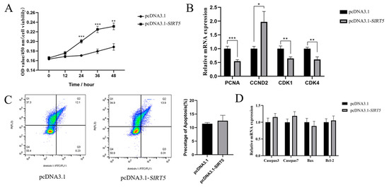 To investigate the functional role of SIRT5 in cellular proliferation, we conducted a series of experiments following our initial observation that SIRT5 gene interference inhibits cell proliferation. To determine whether SIRT5 overexpression promotes cell proliferation, we assessed cell viability with the CCK-8 assay and flow cytometry analysis. The experimental results revealed a statistically significant enhancement in cell viability in the pcDNA3.1-SIRT5 group compared to the pcDNA3.1 control group at three time points: 24 h (p < 0.01), 36 h (p < 0.01), and 48 h (p < 0.05, Figure 5A). In parallel, we examined the expression profiles of proliferation-associated genes in adipocytes overexpressing SIRT5. Quantitative analysis demonstrated that SIRT5 upregulation resulted in a marked reduction in the expression levels of PCNA (p < 0.001), CDK1 (p < 0.01), and CCND2 (p < 0.01) genes while simultaneously inducing a significant increase in CCND2 expression (p < 0.05, Figure 5B). To further characterize the biological effects of SIRT5 overexpression, we evaluated its impact on adipocyte apoptosis using flow cytometry. The quantitative analysis indicated that SIRT5 overexpression did not significantly influence the apoptotic rate of goat adipocytes (Figure 5C). Consistent with these findings, subsequent examination of apoptosis-related gene expression profiles showed that SIRT5 overexpression failed to substantially alter the expression levels of key apoptotic markers, including Casepas7, Casepas3, Bax, and Bcl-2 (Figure 5D). These comprehensive findings suggest that while SIRT5 overexpression significantly enhances cellular viability and modulates the expression of proliferation-related genes, it does not appear to exert substantial effects on adipocyte apoptosis or the expression of apoptosis-related genes under the experimental conditions employed in this study.