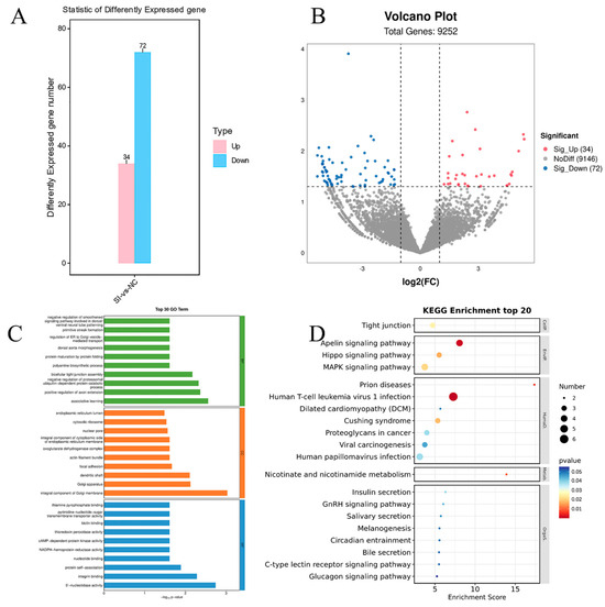 To elucidate the molecular mechanisms underlying lipid deposition promotion through SIRT5 gene interference, we conducted sequencing and comprehensive analysis of total RNA transcriptomes from both SIRT5-interfered goat adipocytes and negative controls. As illustrated in Figure 6A,B, our analysis identified 106 differentially expressed genes (DEGs) meeting the significance thresholds (p < 0.05, logFC > 2). The DEG profile revealed 72 downregulated genes and 34 upregulated genes. Subsequent Gene Ontology (GO) enrichment analysis, presented in Figure 6C, demonstrated that the DEGs were significantly enriched across three major categories: (1) biological processes, particularly in cellular processes, metabolic processes, bioregulation, bioprocess regulation, and cellular component organization or biosynthesis in response to stimuli; (2) cellular components, with predominant enrichment in cell parts, organelles, organelle parts, and membranes; and (3) molecular functions, primarily involving binding, catalytic activity, and molecular structure regulation. To further investigate the signaling pathways associated with these DEGs, we performed KEGG pathway analysis. The results, depicted in Figure 6D, revealed significant enrichment of DEGs in several critical pathways, including focal adhesion, cancer-related proteoglycans, the MAPK signaling pathway, the glycolysis/gluconeogenesis signaling pathway, pathways in cancer, and the Hippo signaling pathway. These findings provide valuable insights into the complex regulatory networks involved in lipid deposition following SIRT5 interference.
